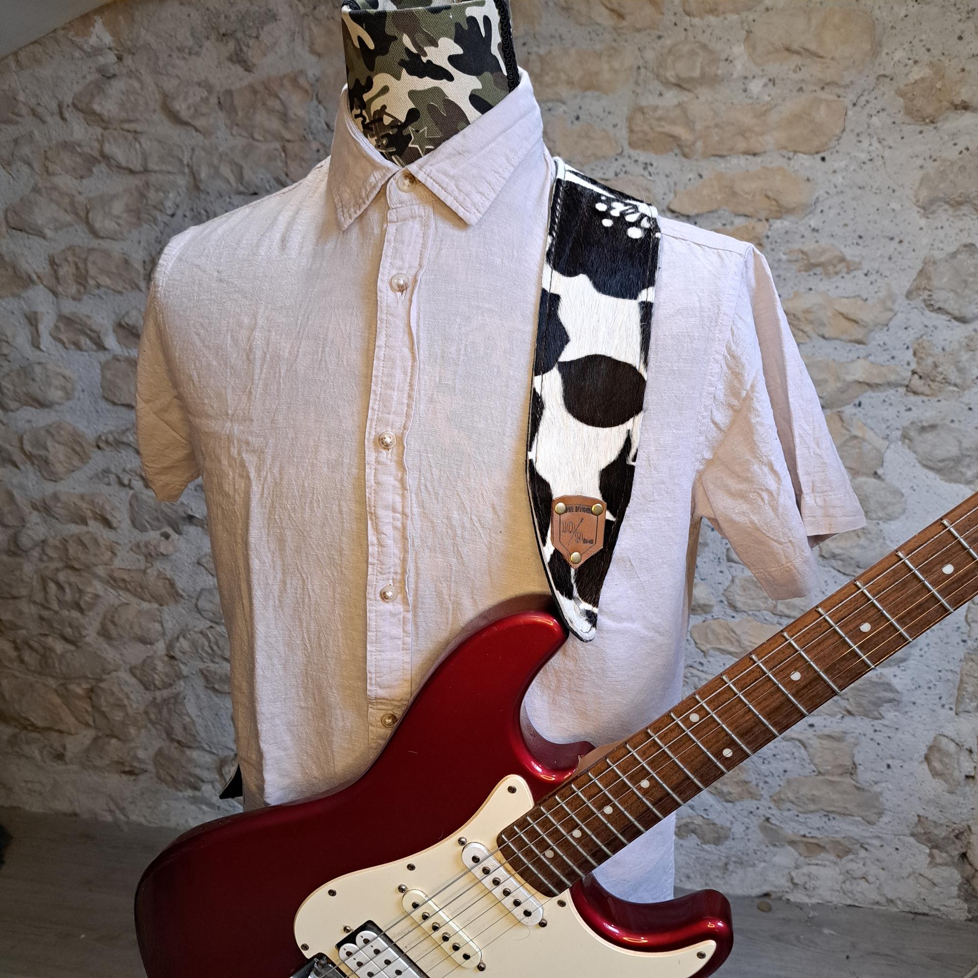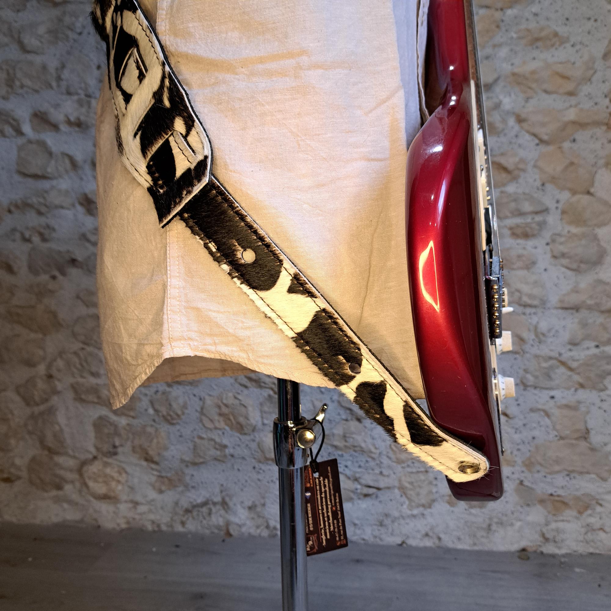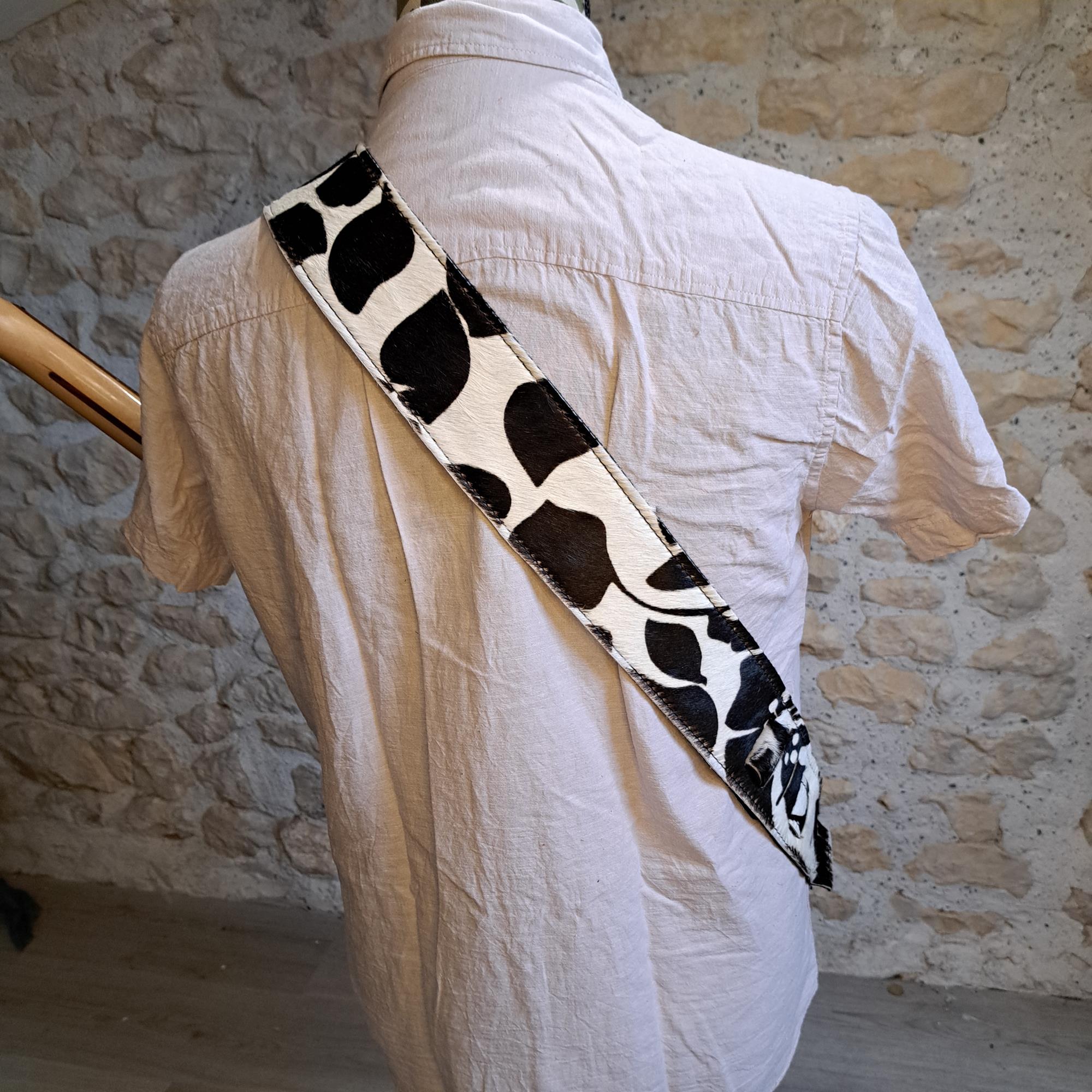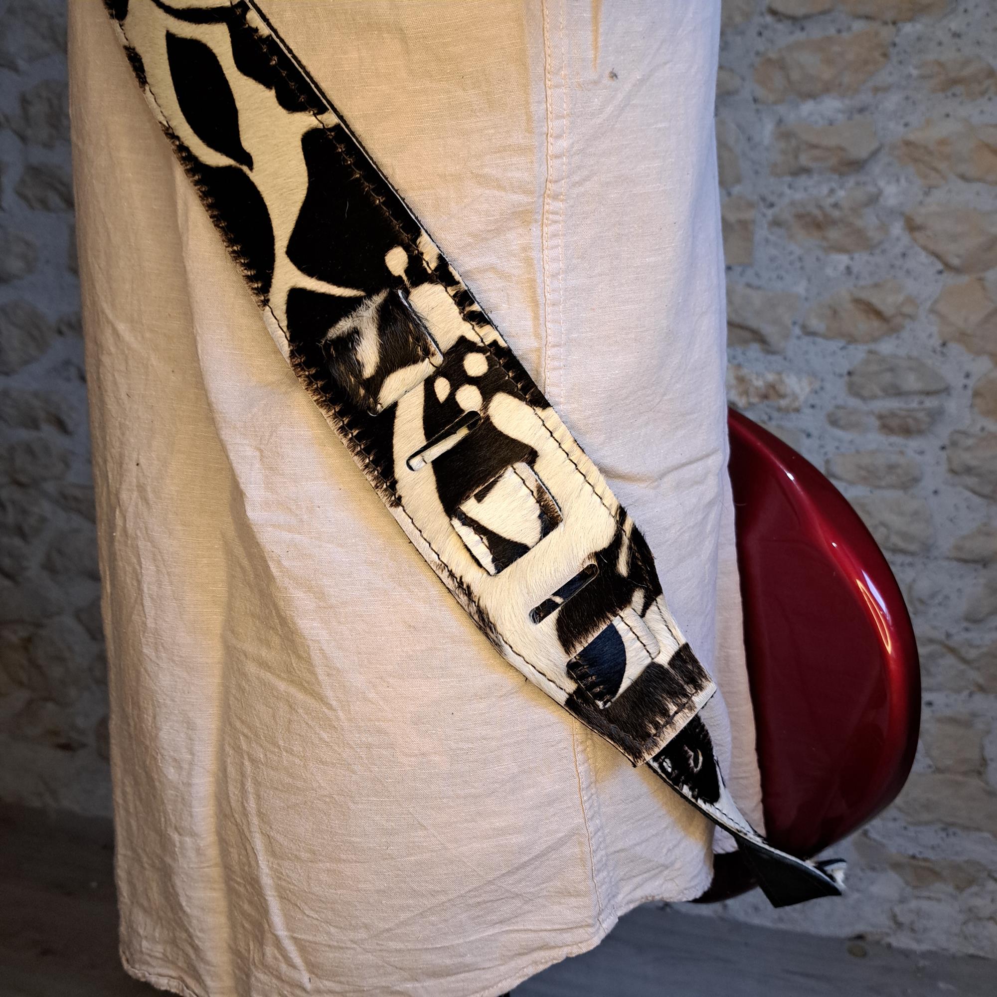 - Sangle guitare ou basse en cuir noir et blanc poilu doublé noir piqûres noire