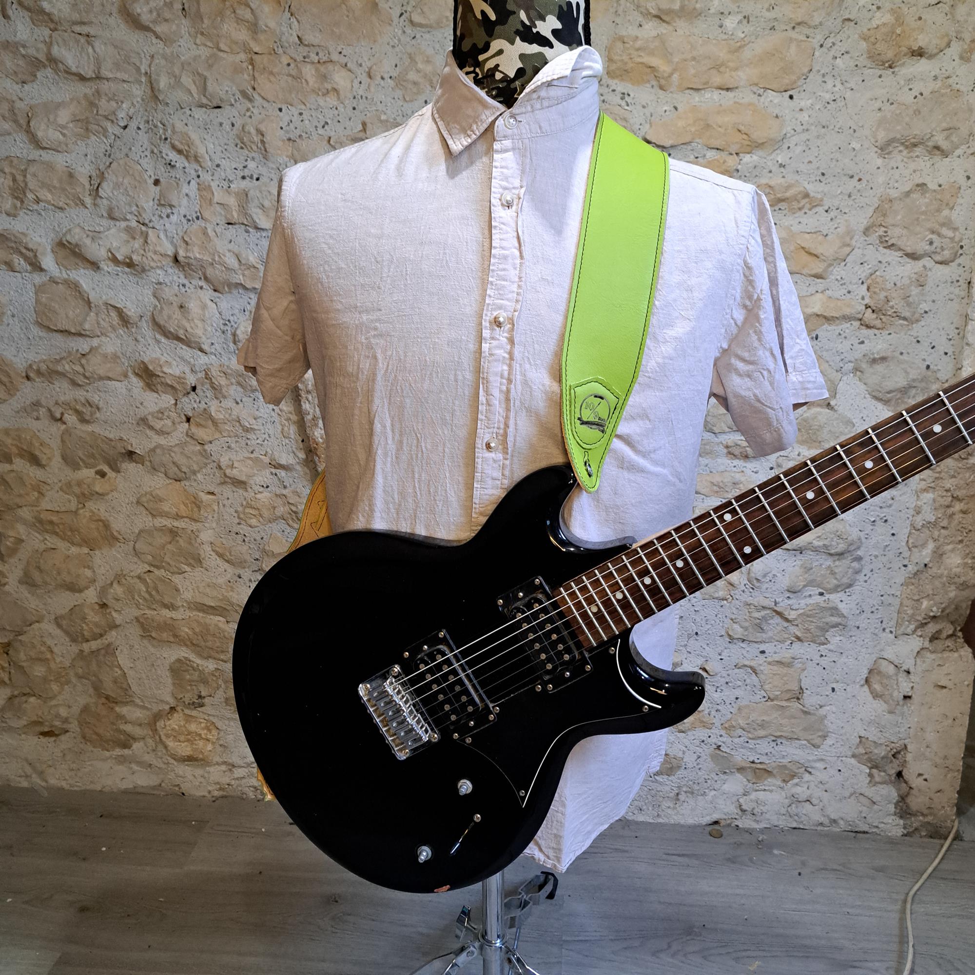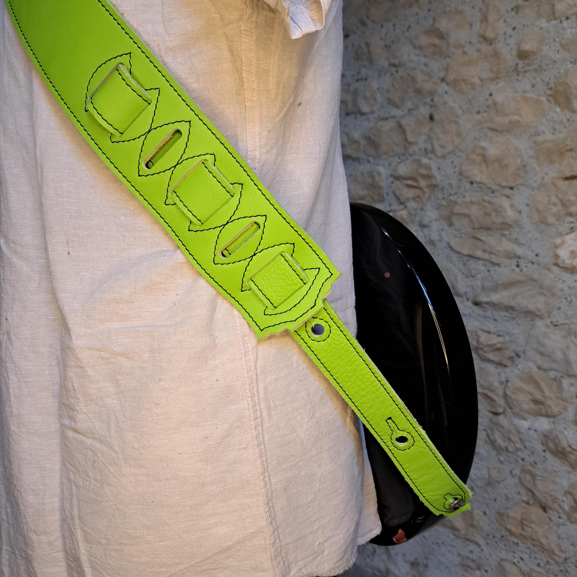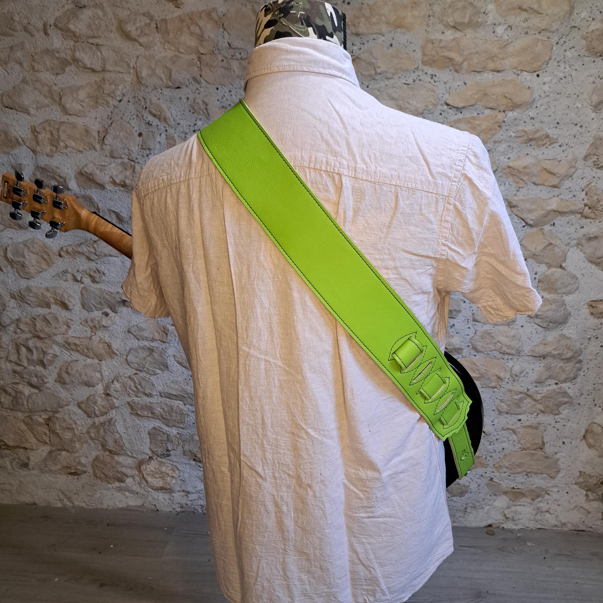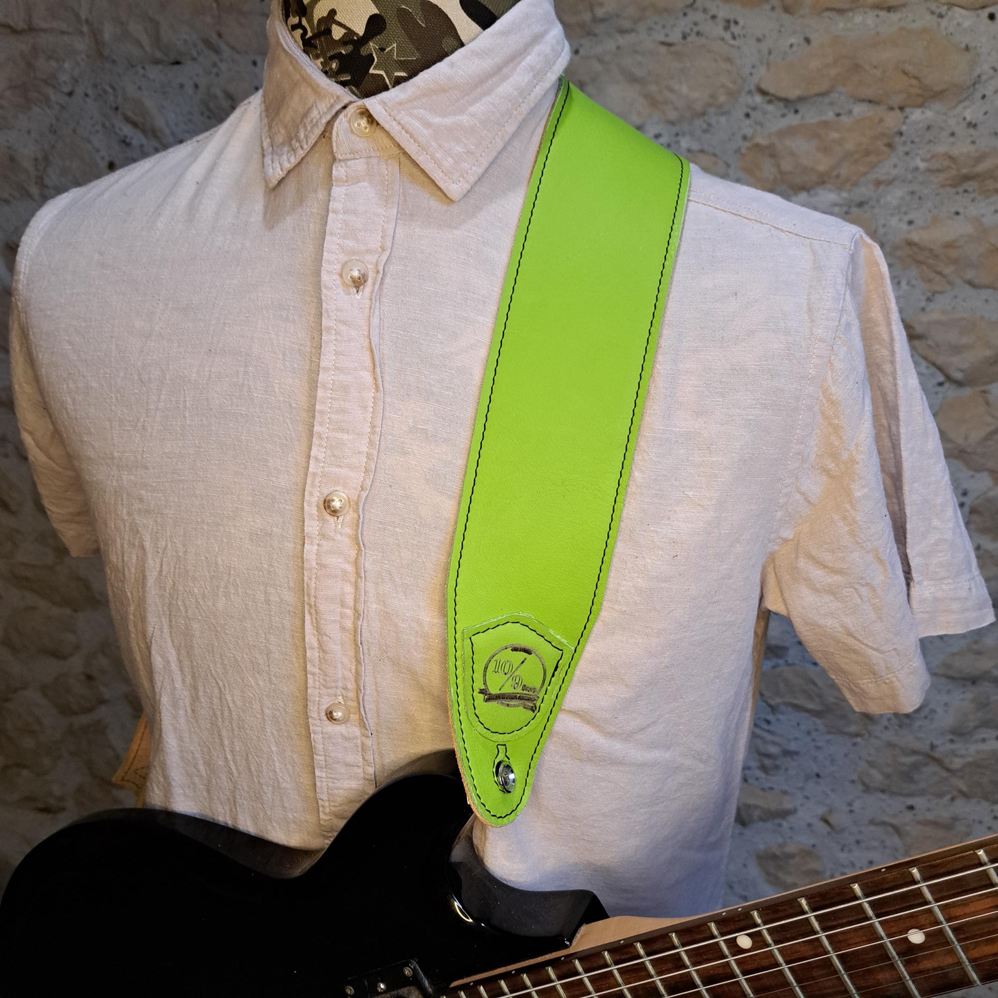 - Sangle guitare ou basse en cuir vert pomme piqûre marron