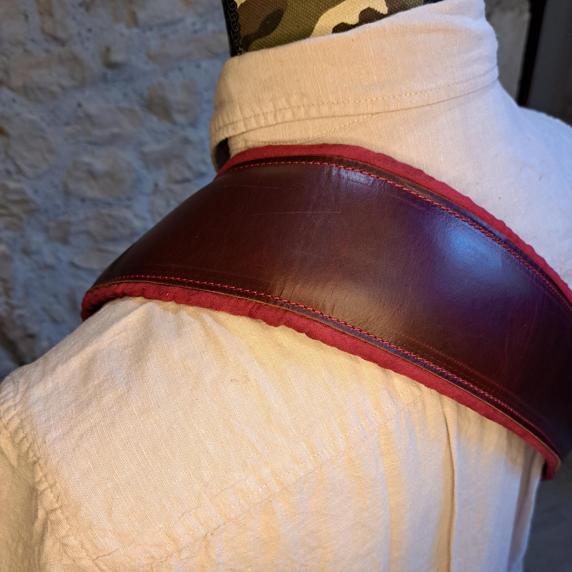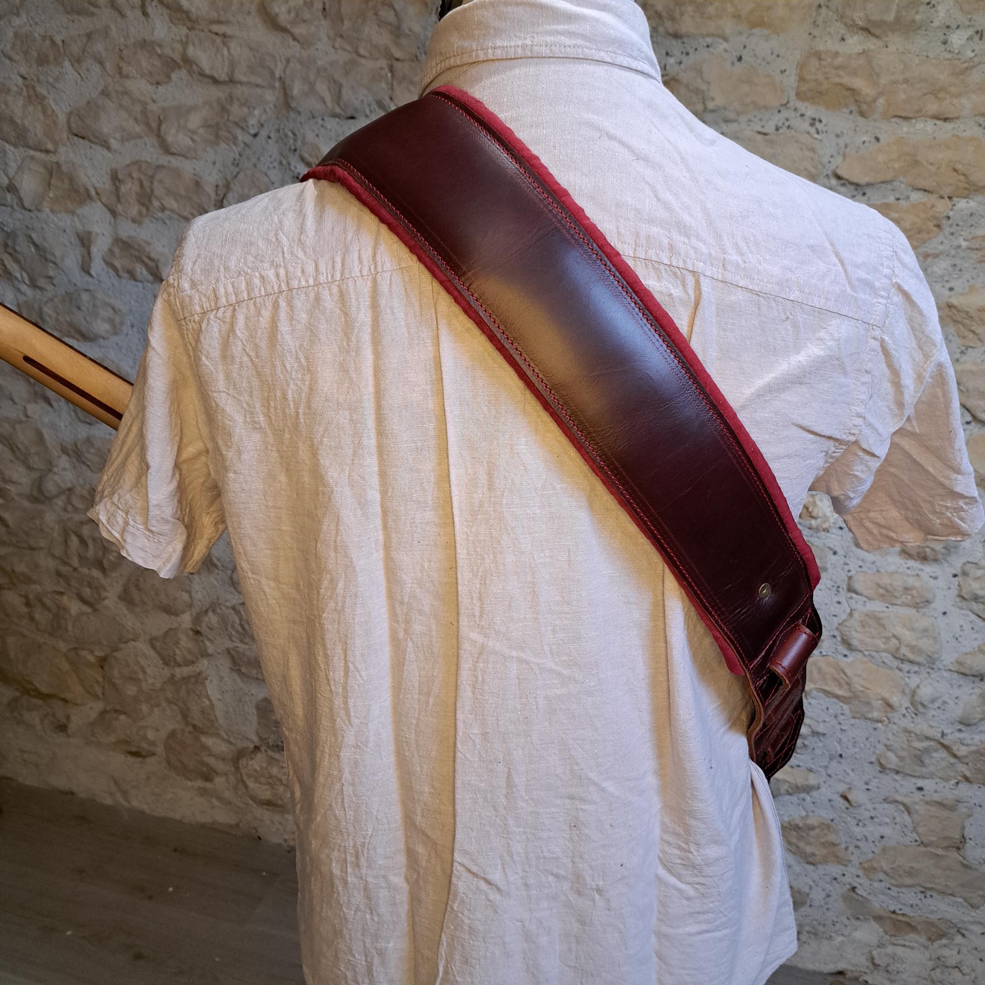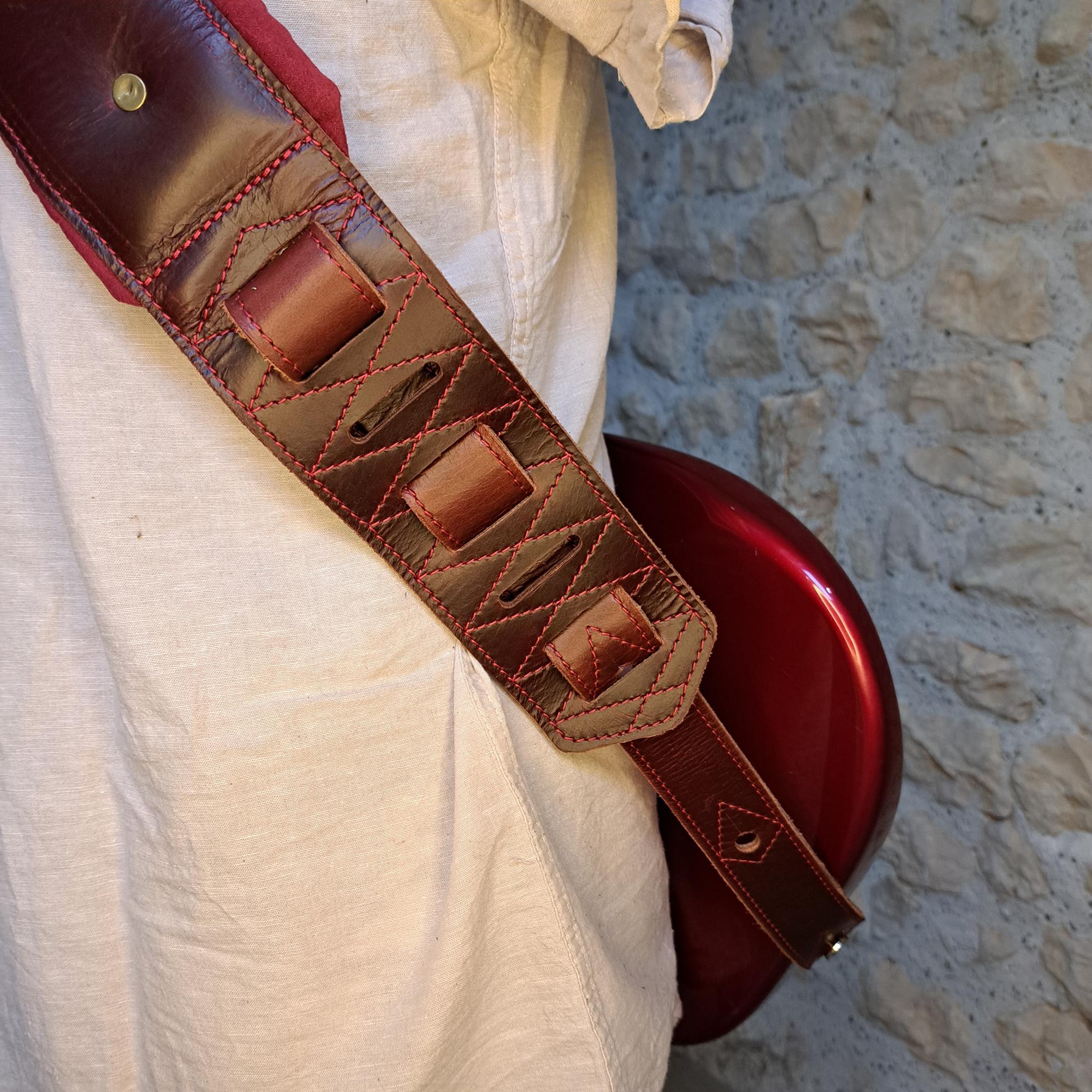 - Sangle pour guitare/basse en cuir marron, rembourrée, doublée suédine rouge.