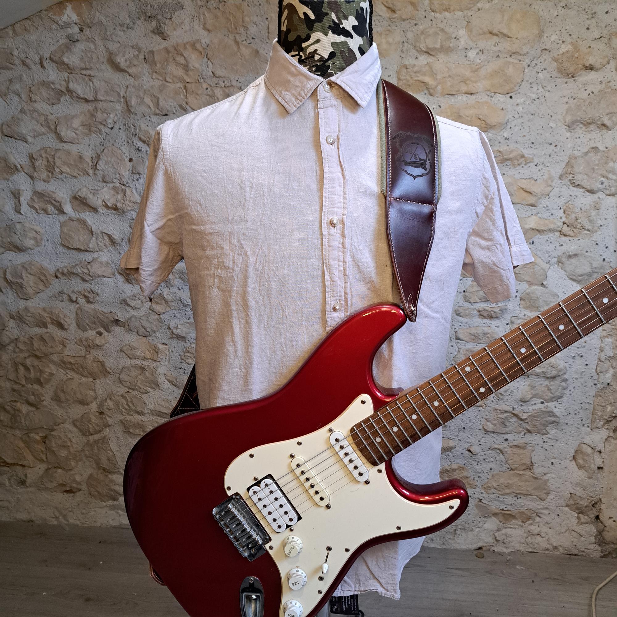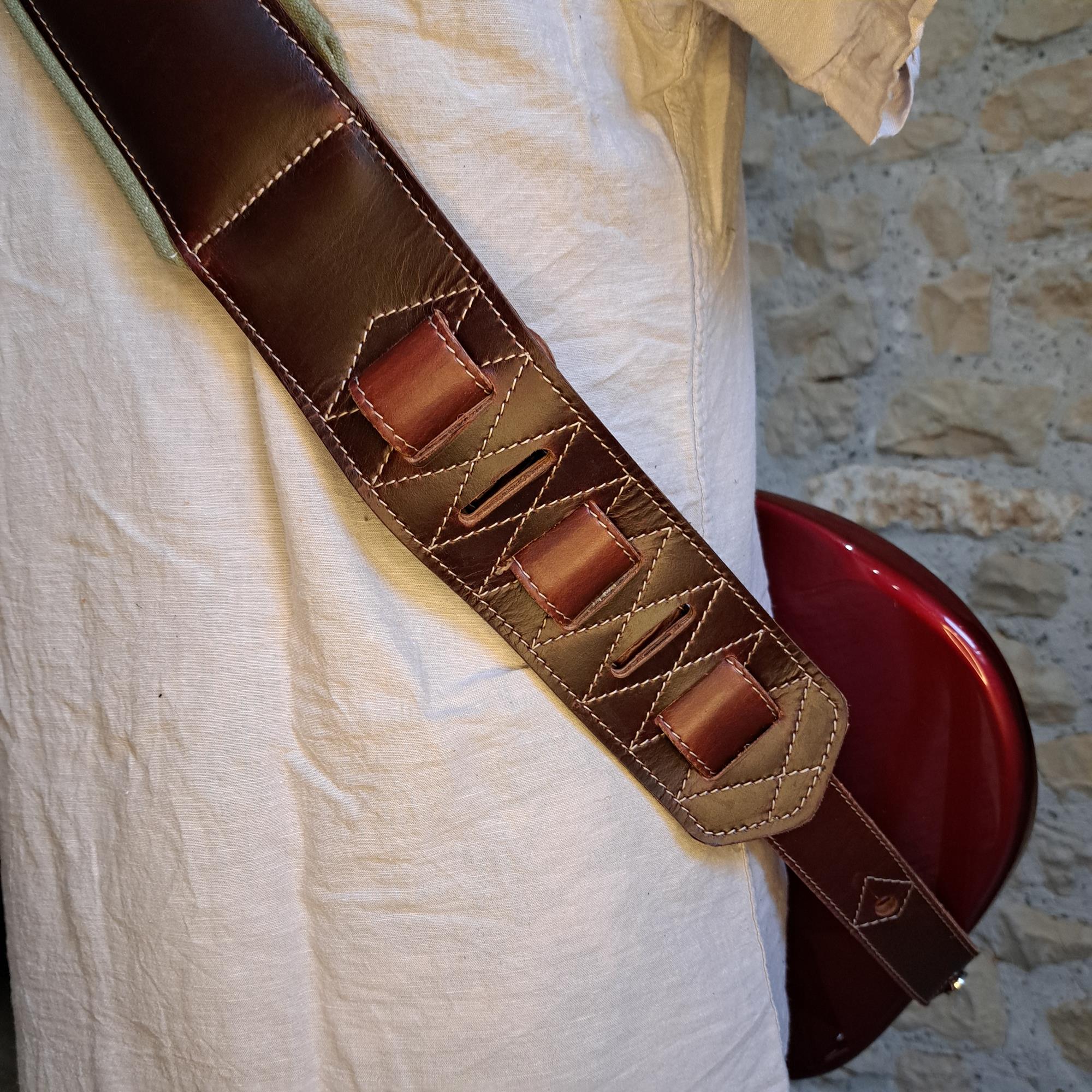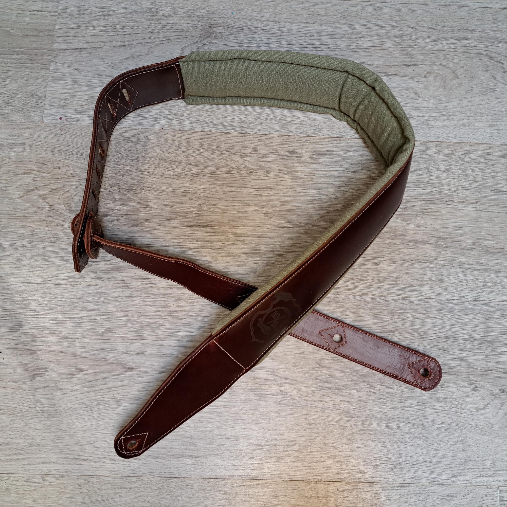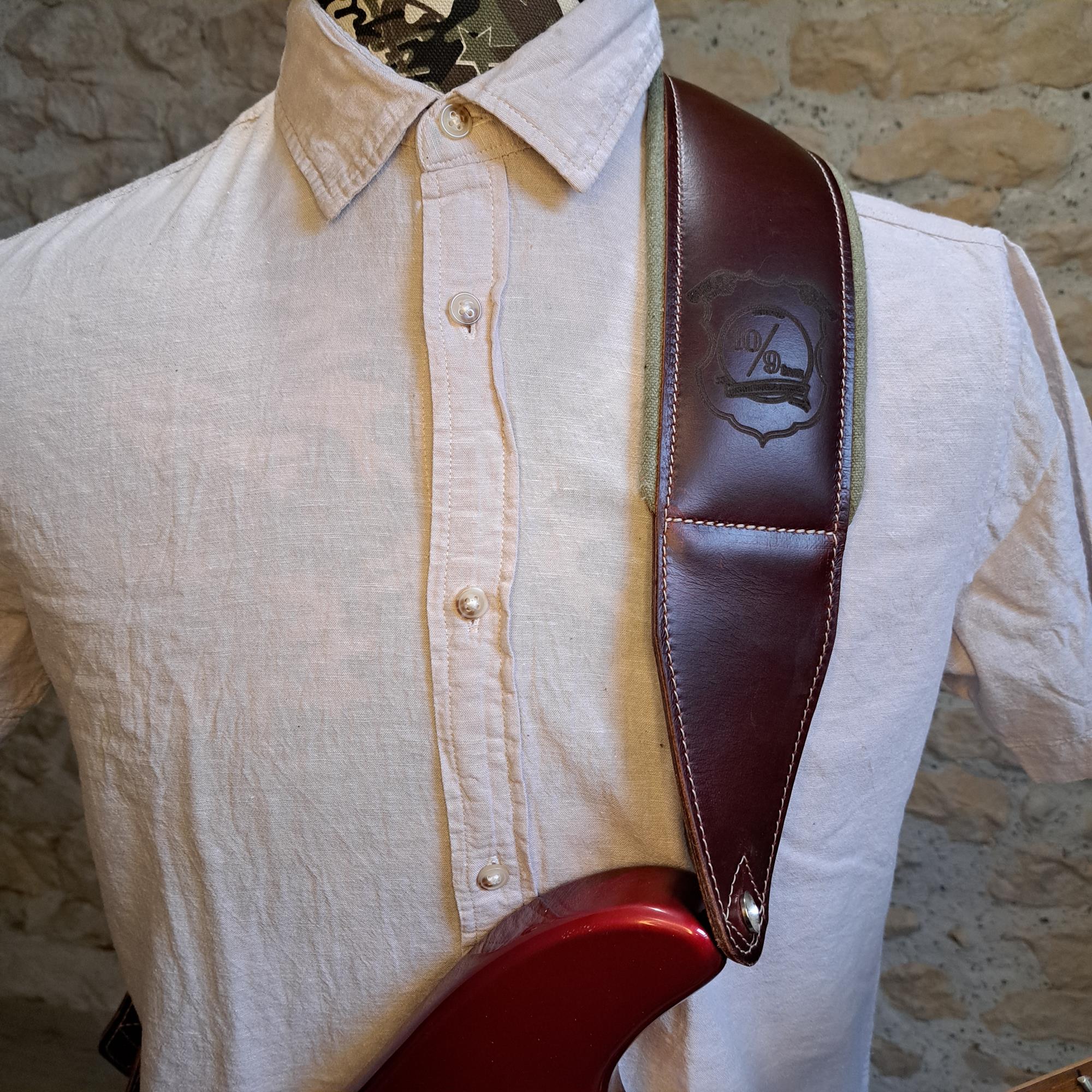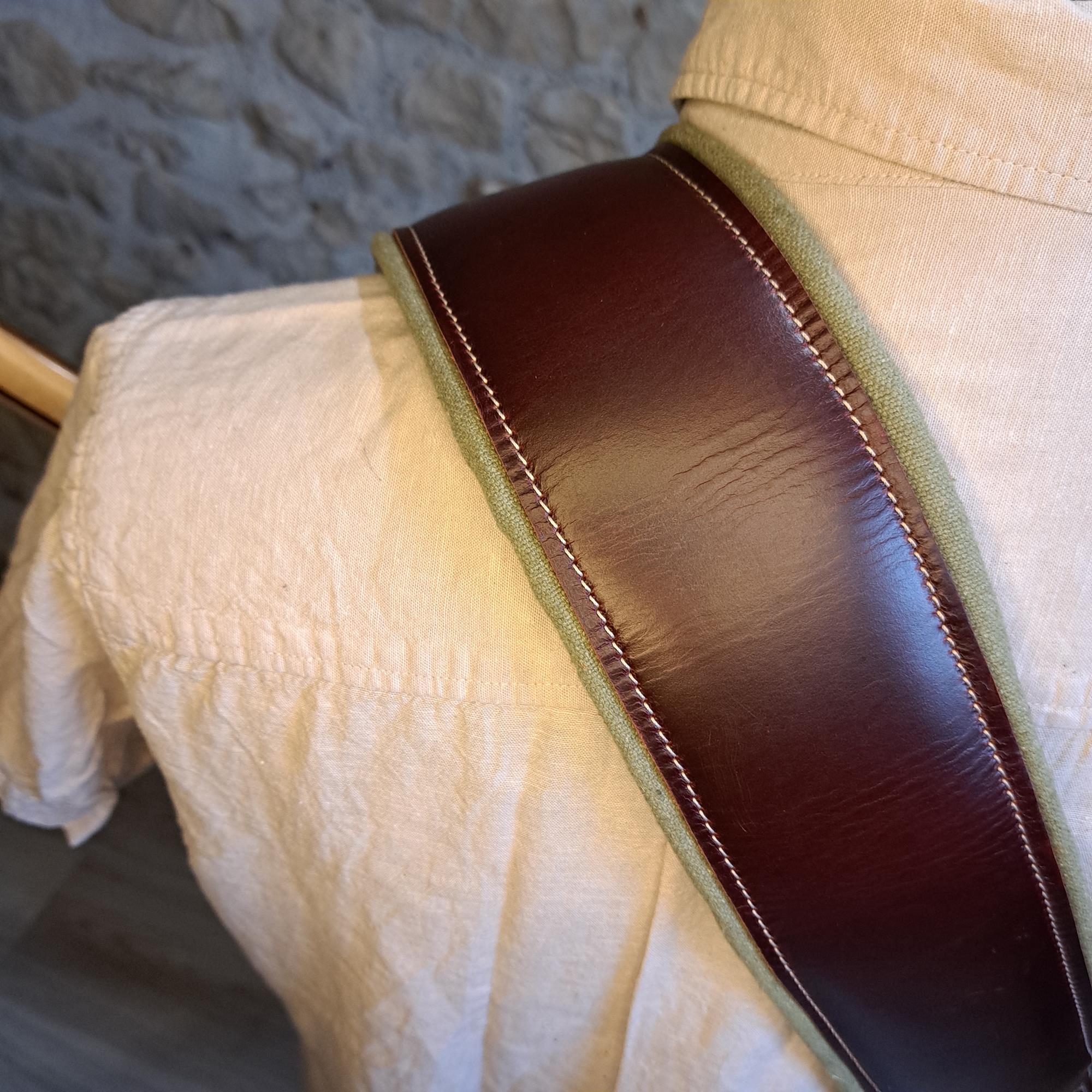 - Sangle pour guitare/basse en cuir marron, rembourrée, doublée vercors kaki.