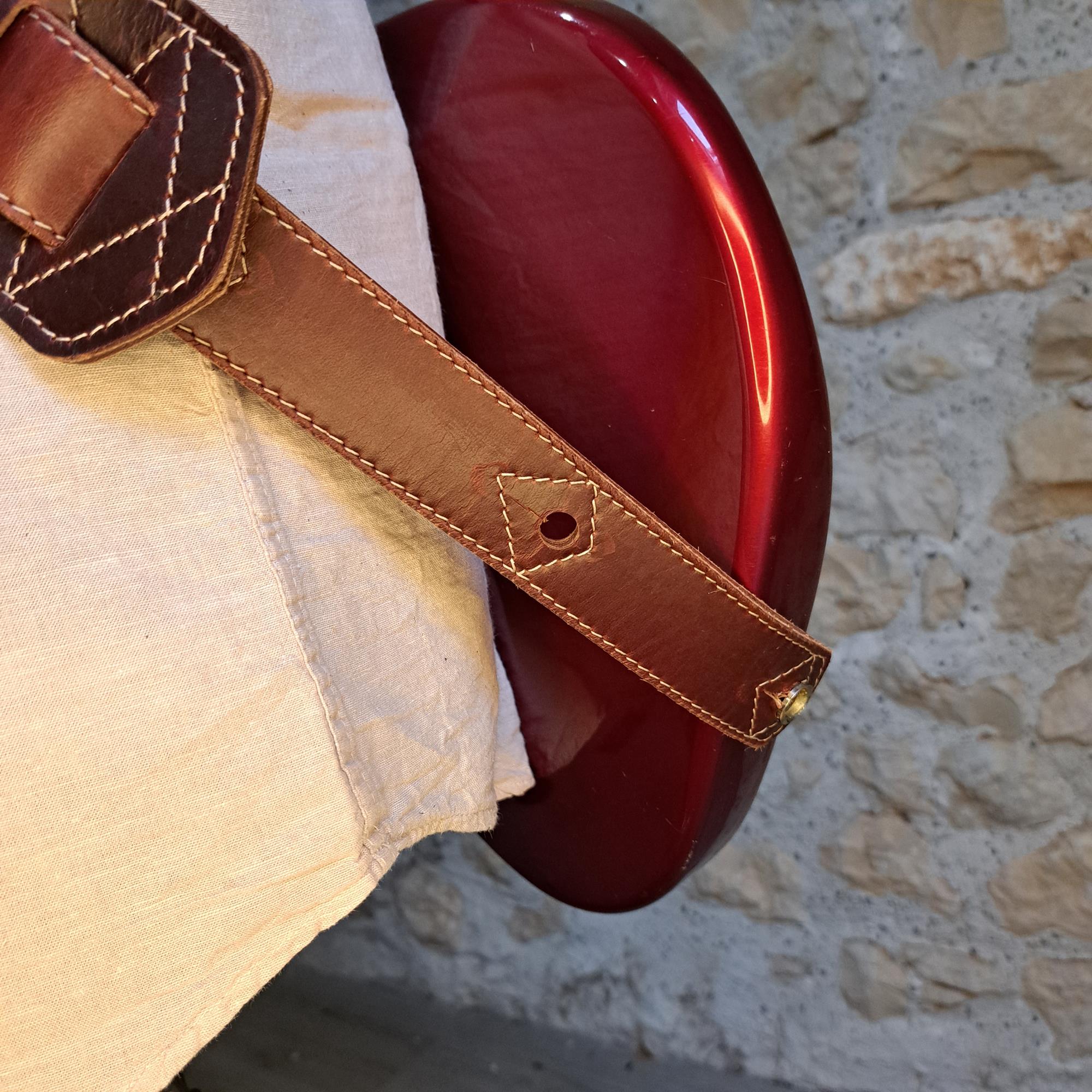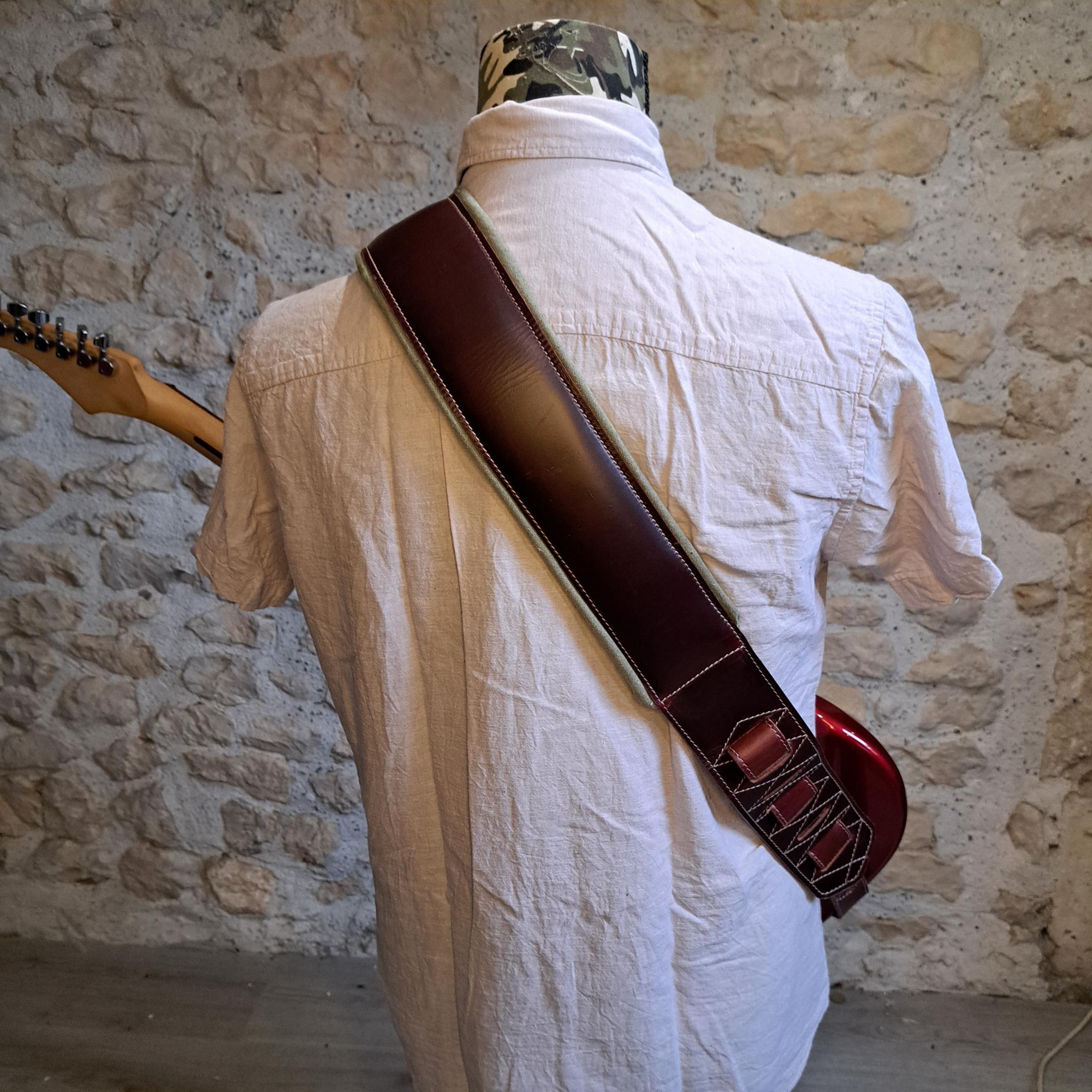 Sangle pour guitare/basse en cuir marron rouge, rembourrée, doublée tissus vercors kaki et surpiqûre beige