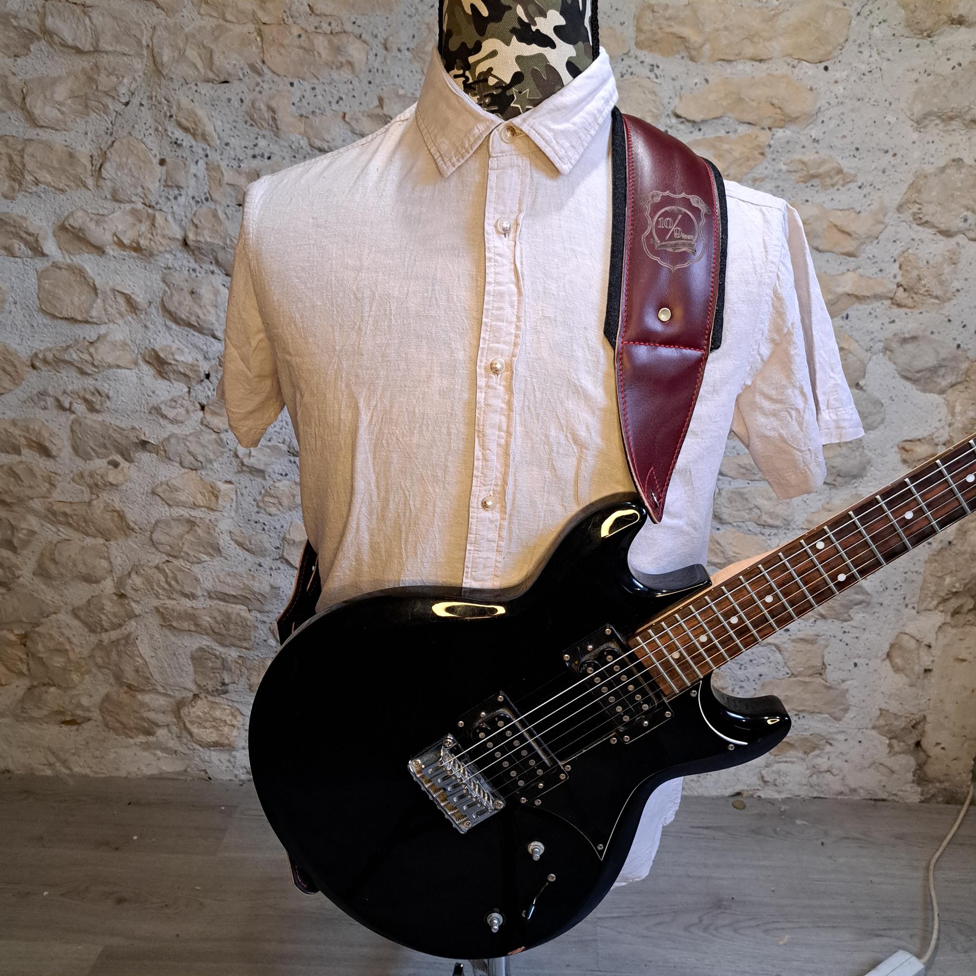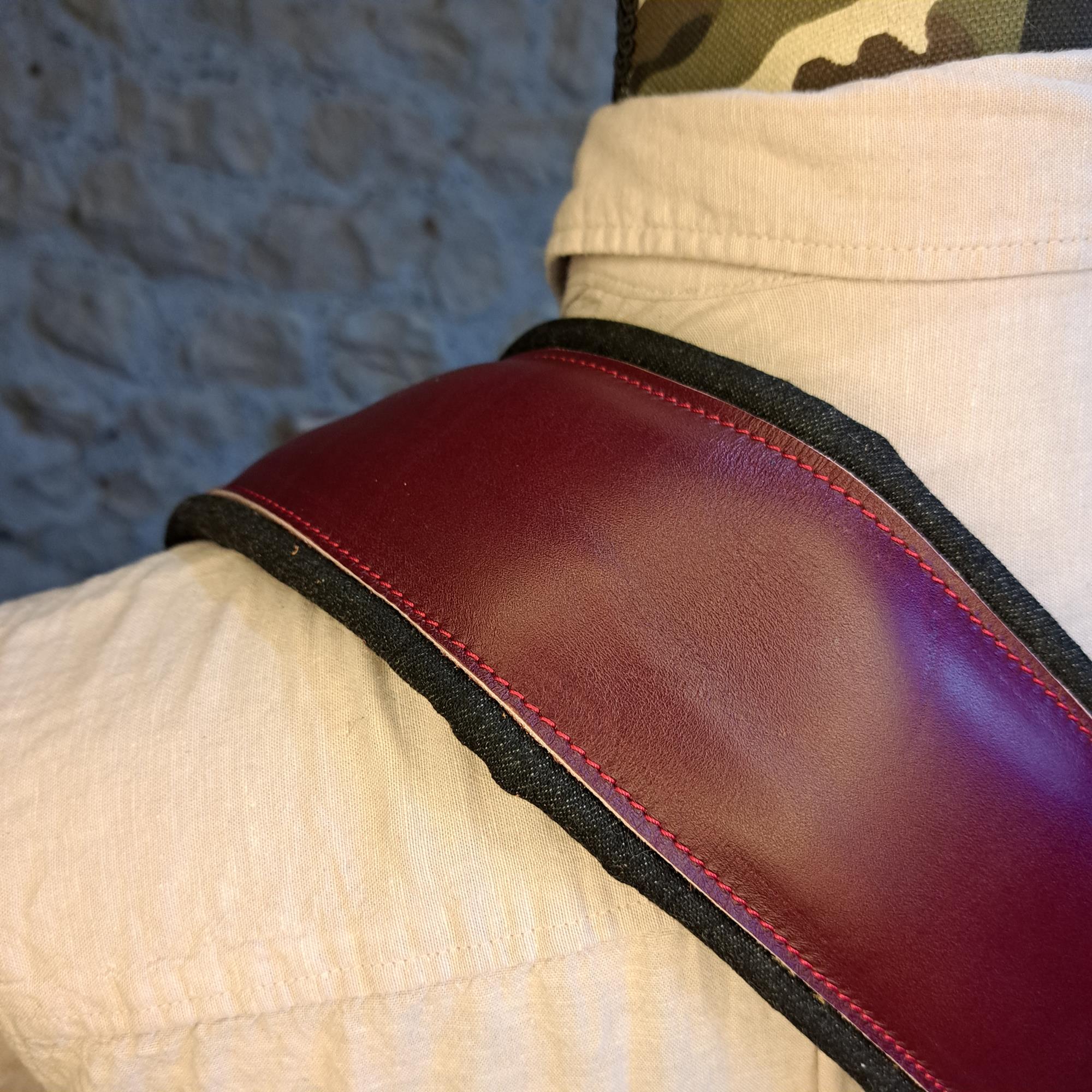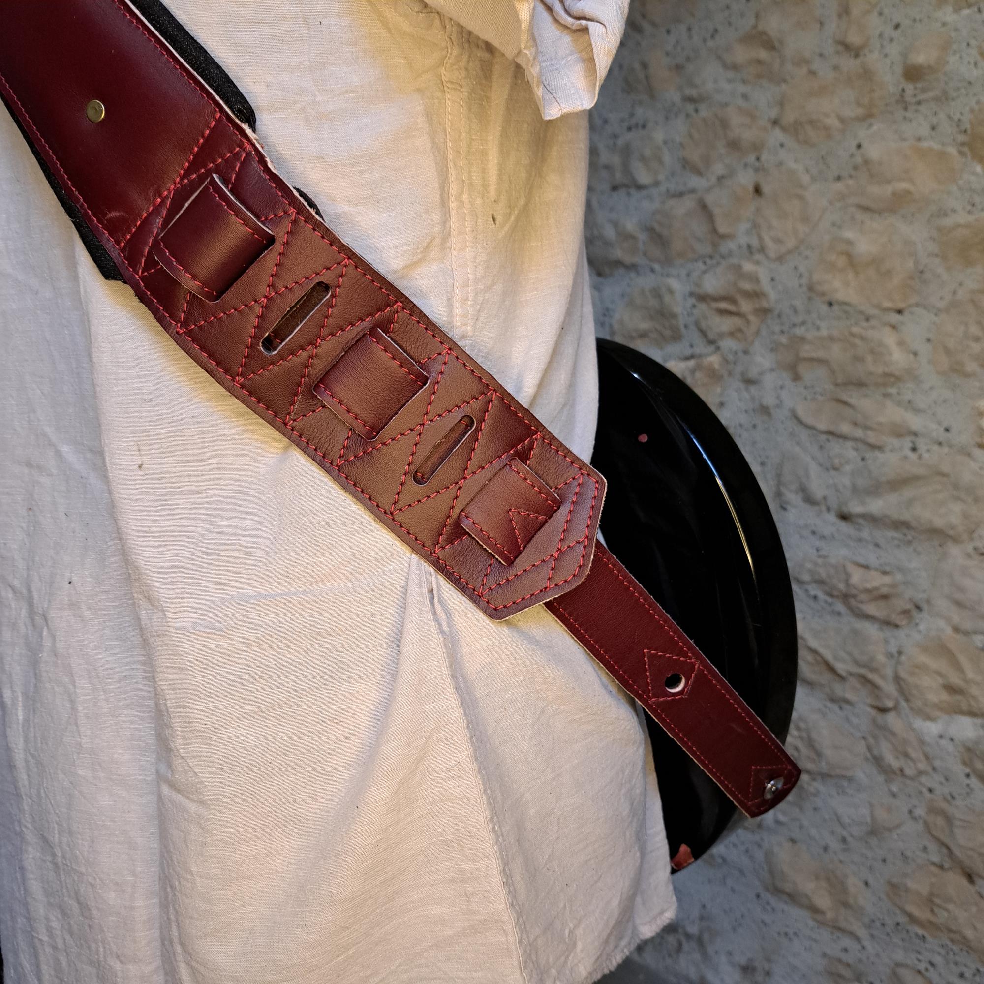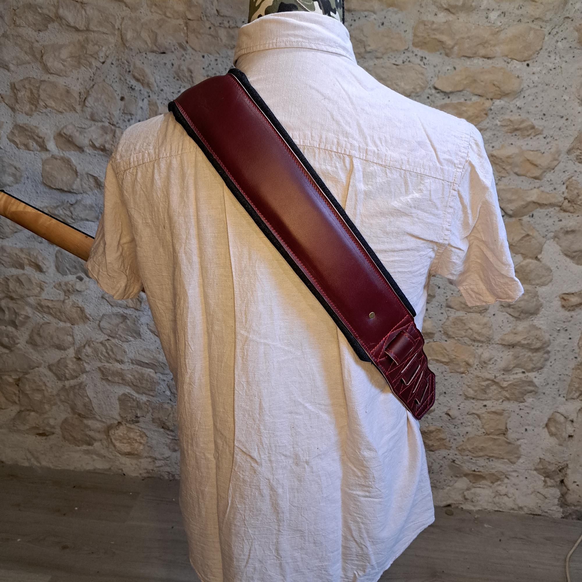- Sangle pour guitare/basse en cuir rouge, rembourrée, doublée denim noir.