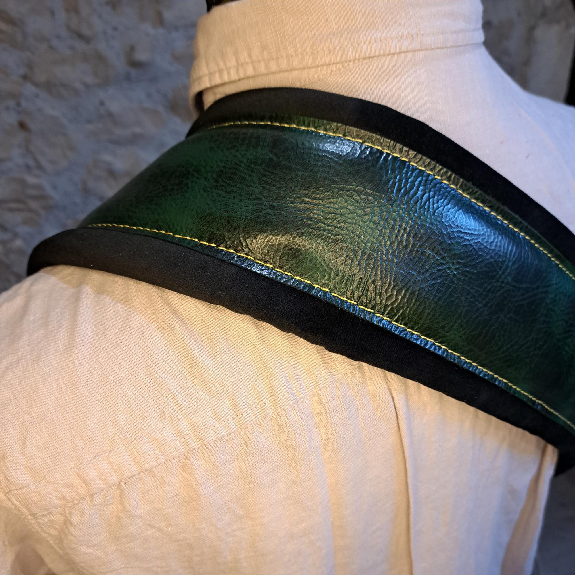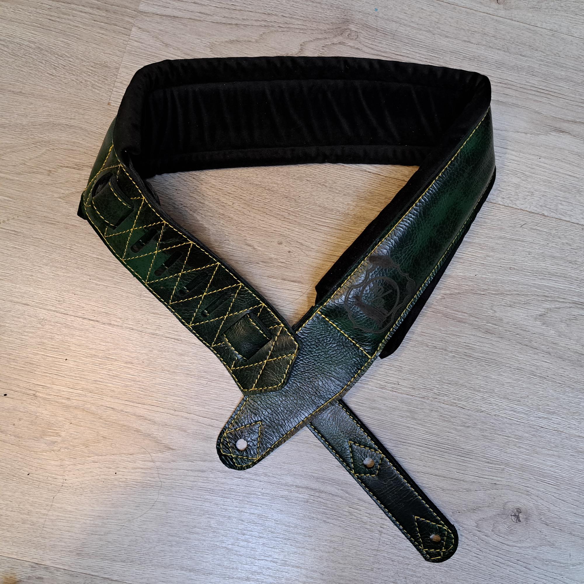 Sangle pour guitare/basse en cuir vert, rembourrée, doublée velours noir et surpiqûres jaunes;