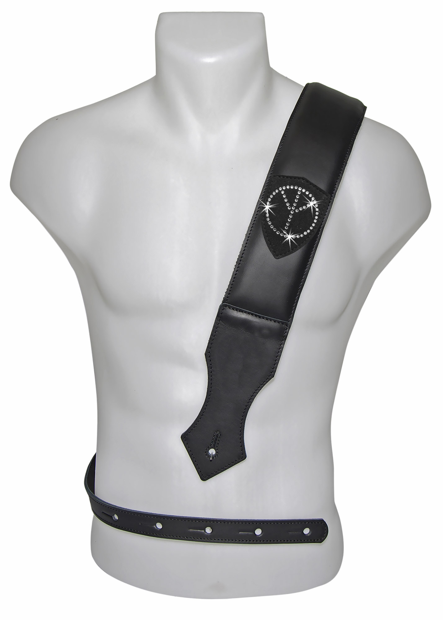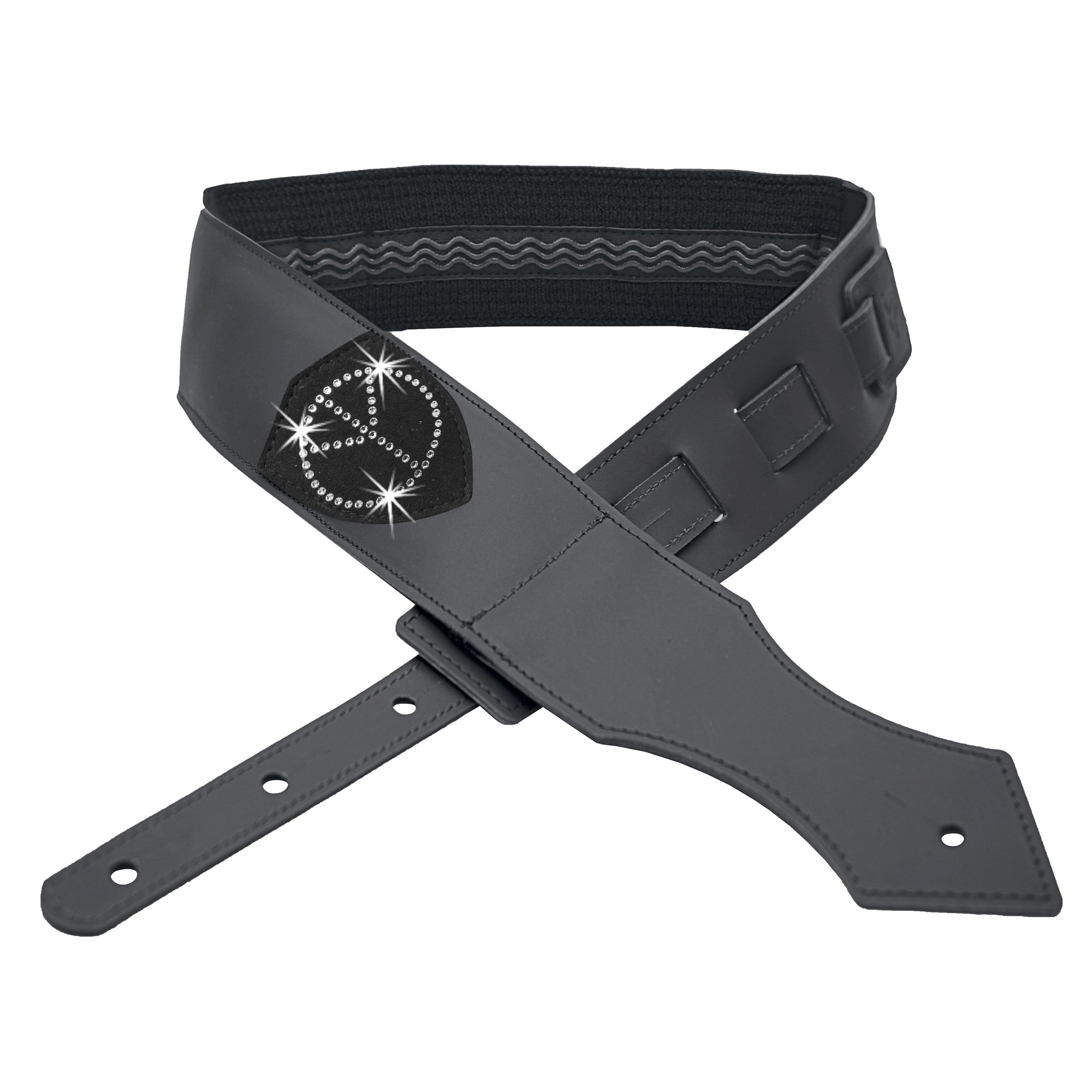 CUIR NOIR - Sangle Logo Peace & Love Glam - Doublé de laine polaire + éponge coton + bande Antiglisse - Pour guitare électrique / basse.