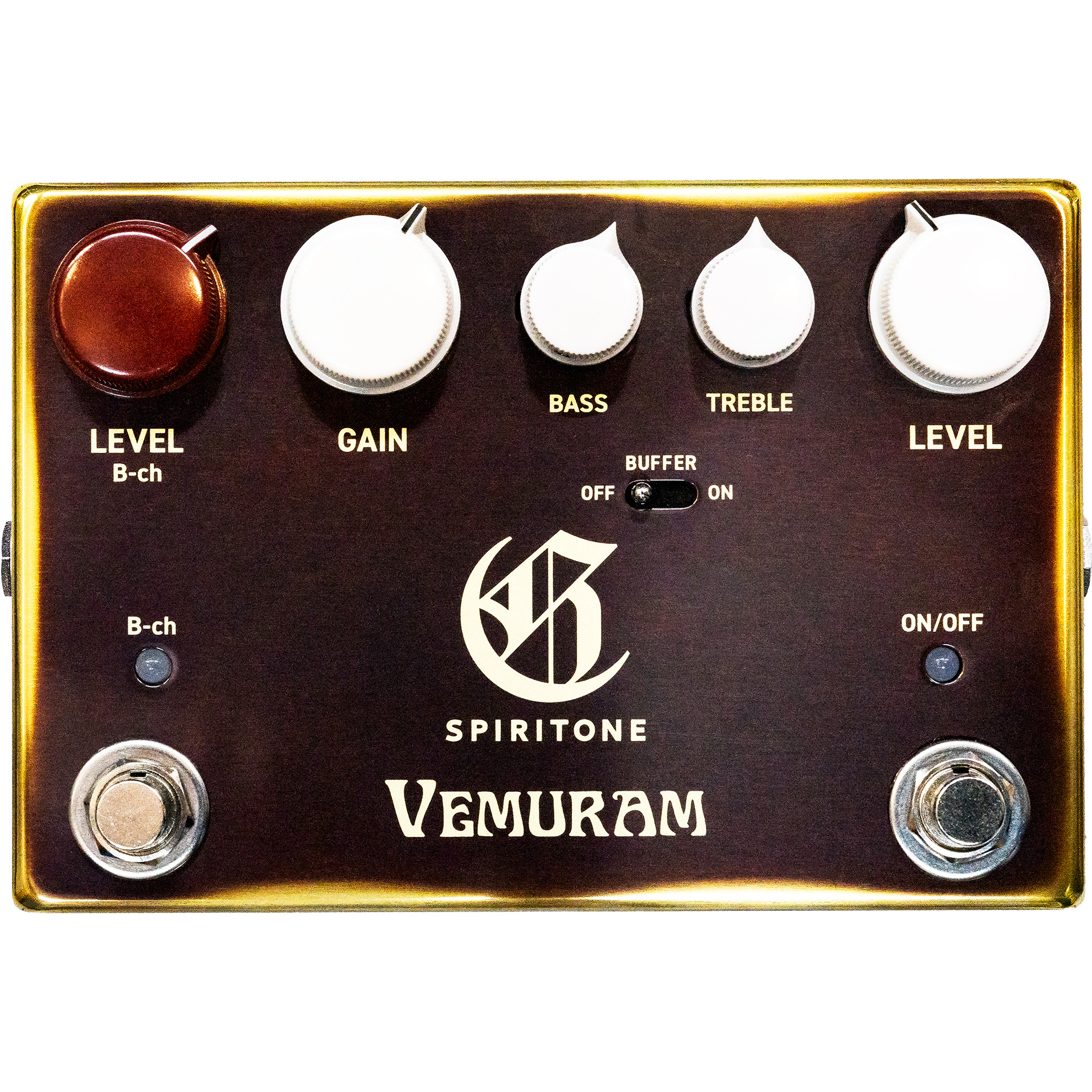 La Spiritone est fabriquée avec des composants personnalisés de haute qualité comme des footswitches, des prises d'entrée/sortie et des condensateurs sur mesure, ainsi que des composants N.O.S. (New Old Stock) rares. Cette pédale a été conçue pour mettre l'accent non seulement sur le son mais aussi sur les détails comme les boutons en bakélite de couleur custom blanc cendré, pour une finition unique.